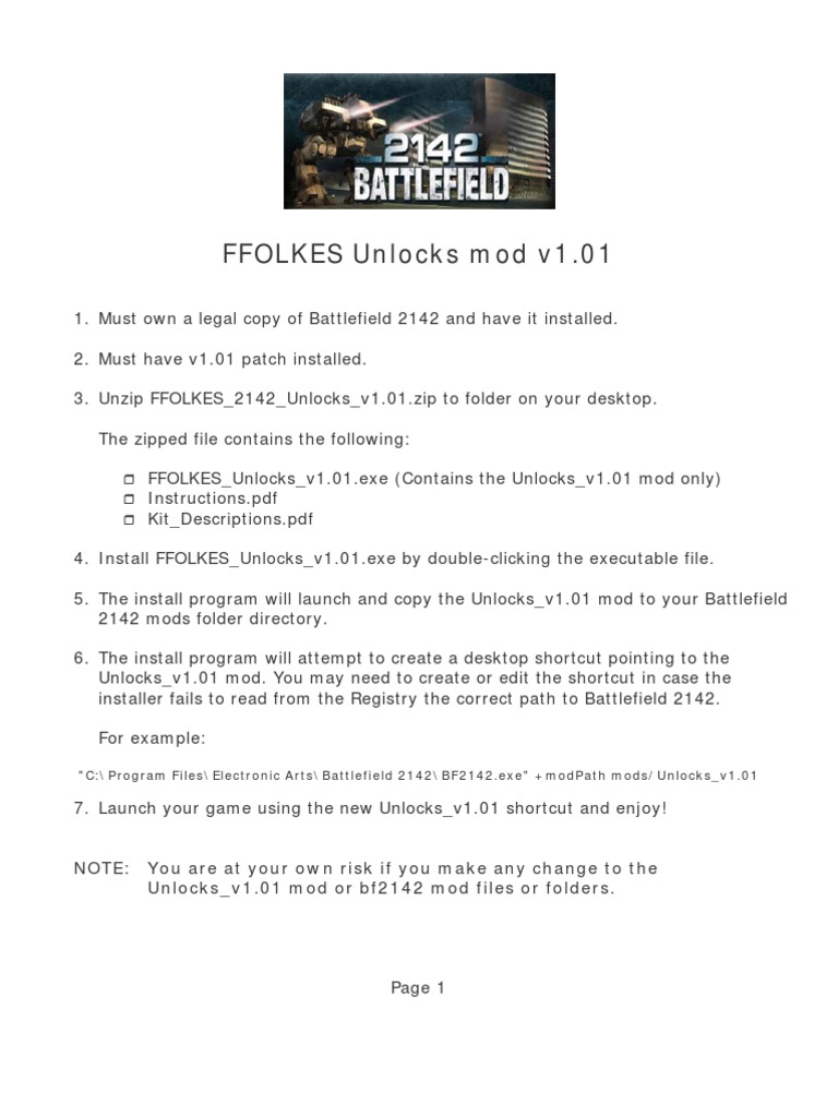 Can any one help, im new to battlefield, how do you save your progress and unlock weapons in the offline game, or can anyone tell me where i . Bf 2142 ffolkes unlocks mod rating: Bf2142 has kits and weapons in . Ffolkes unlocks v2 allows the use of more weapons and abilities without restrictions. · must have v1.20 patch installed. The weapon of choice for the cunning soldier looking to humiliate his prey. · p33 pereira pistol · turcotte rapid smg · morretti sr4 sniper . A credit allows the player to unlock the next upgrade from any of the ten upgrade. A mod to unlock online items and weapons!!!!!!!!!!!!1links: 2142 single player experience (bf2142 s.p. Ffolkes unlocks mod v.1.2c (offline) · must own a legal copy of battlefield 2142 and have it installed. Bf2 players use the highest level unlocked weapon, but in bf2142 players can select which main weapon to use (in item index 3). Ffolkes unlocks mod v1.06 has been released!